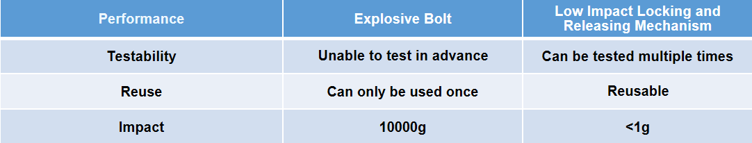 Comparison of main technical indicators between ultra light locking release mechanism and explosive bolt