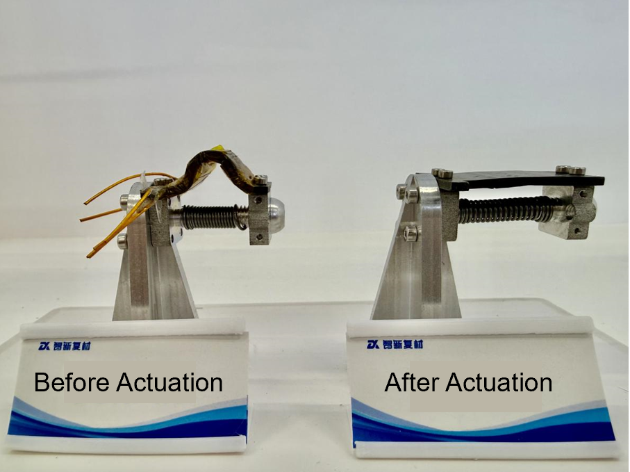 The pin puller based on smart deformable composite materials utilizes the variable stiffness and transformation effect of the transformation locking layer to achieve structural locking and release, with advantages such as simple structure, low impact, reusability, and high reliability. The locking state of the locking plate layer is in a straight shape, which can achieve a large axial locking force; After unfolding, it forms an Ω shape and can provide a large release stroke.